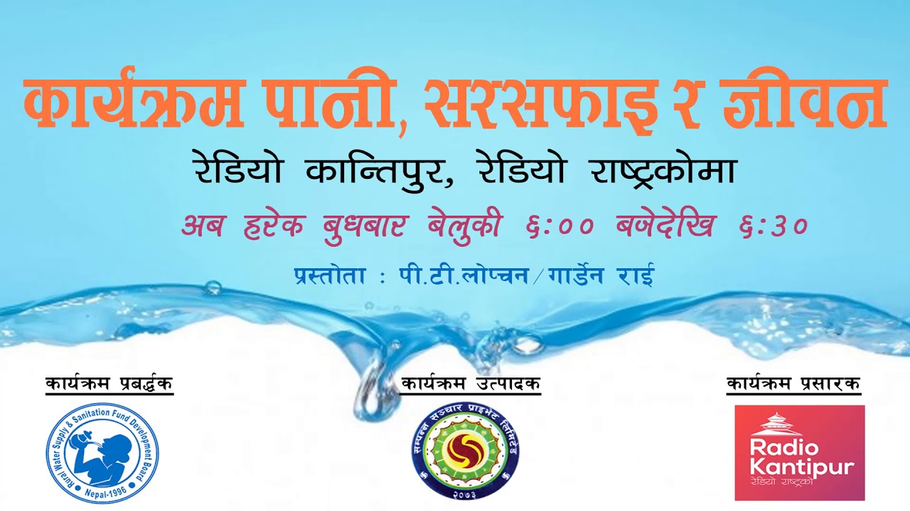 यो रेडियो कार्यक्रम पानी, सरसफाइ र जीवनको तेस्रो अंक हो । रेडियो कान्तिपुर, रेडियो राष्ट्रकोमा हरेक बुधबार बेलुकी ६ बजे प्रसारण हुने यो कार्यक्रममा परम्परागत खानेपानी तथा सरसफाइ आपूर्तिमा सुधार ल्याउन, फण्ड बोर्डले अबलम्बन गरिरहेको अवधारणा, विधि र प्रक्रियाका बारेमा विभिन्न सामग्री प्रस्तुत गर्छौ ।