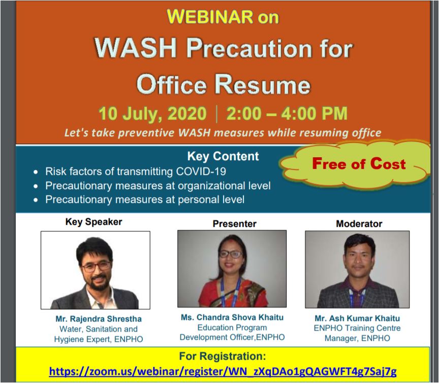 वातावरण र जनस्वास्थ्य संस्था (एन्फो) ले WASH Precaution for Office Resume बिषयमा वेबिनार गर्दैछ । जुलाई १० तदानुसार असार २६ गते दिउँसो २ बजेदेखि ४ बजेसम्म हुने वेबिनारमा तपाई पनि सहभागी बन्न सक्नुहुन्छ । उक्त वेबिनारमा छलफल हुने मुख्य बिषयबस्तुहरु :