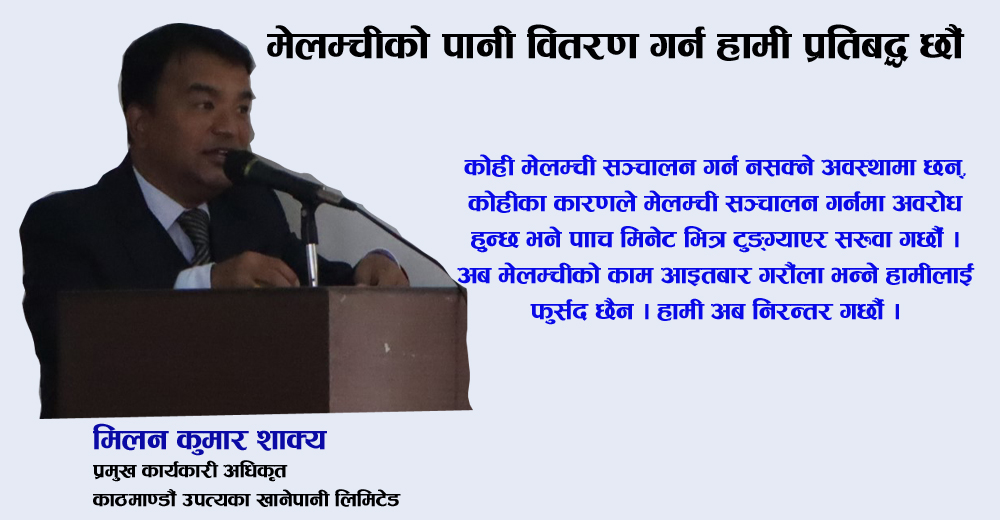 काठमाडौ : काठमाण्डौ उपत्यका खानेपानी लिमिटेडका प्रमुख कार्यकारी अधिकृत मिलन कुमार शाक्यले मेलम्चीको पानी काठमाडौ उपत्यकामा वितरण गर्न केयूकेएल सक्षम र प्रतिबद्ध रहेको बताउनुभएको छ । केयूकेएलको १३ औं बार्षिकोत्सवको अवसरमा आयोजित मेलम्चीको पानी वितरणमा केयूकेयलको तयारी बिषयक कार्यशाला गोष्ठीमा कार्यकारी अधिकृत शाक्यले मेलम्चीको पानी सुन्दरीजल पानी प्रशोधन केन्द्रमा प्रशोधन भएपछि उपत्यकाको घरघरमा पुर्याउन केयूकेएल सक्षम रहेको बताउनुभयो ।