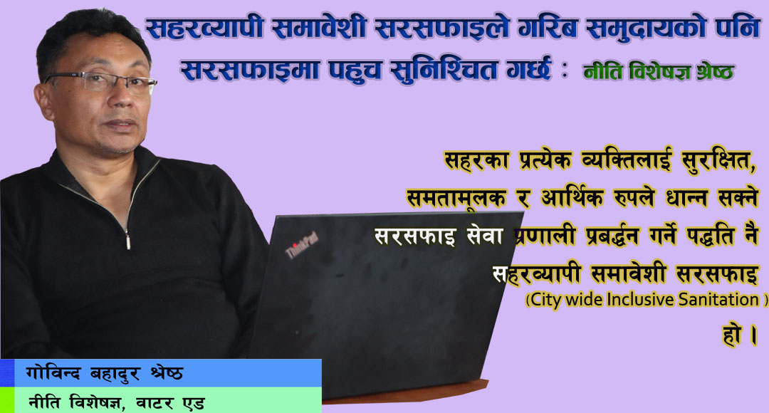 काठमाडौ : सरसफाइ क्षेत्रमा यत्तिबेला ‘सिटी वाईड इन्क्लुसिभ स्यानिटेशन’ अर्थात सहरव्यापी समावेशी सरसफाइको निक्कै चर्चा छ । नगरस्तर देखि मन्त्रालय तहसम्मका सरोकारवाला निकायको ध्यान आकृष्ट गराईरहेको सहरव्यापी समावेशी सरसफाइ भनेको के हो त ? वाटर एड नेपालका नीति विशेषज्ञ गोविन्द श्रेष्ठ भन्नुहुन्छ ‘शहरका प्रत्येक व्यक्तिलाई सुरक्षित, समतामूलक र आर्थिक रुपमा धान्न सक्ने सरसफाइ सेवा प्रणाली प्रबर्द्वन गर्ने पद्धति नै सहरव्यापी समावेशी सरसफाइ (City wide Inclusive Sanitation ) हो ।