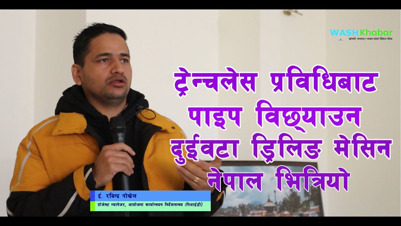 उहाँले नेपालका लागि ट्रेन्चलेस प्रविधि नयाँ भएकाले पाइलटिङको रुपमा सय मिटर मात्र खन्न लागेको र राम्रो नतिजा आएमा यसलाई बढावा दिदै लगिने जानकारी गराउनुभयो । विस्तृतमा हेर्नुहोस्, कुलो/खाडल नखनी पाईप विछ्याउन सकिने (ट्रेन्चलेस) प्रविधि र नेपालमा यसको प्रयोग बिषयक छलफल कार्यक्रममा प्रोजेक्ट म्यानेजर इन्जिनियर रबिन्द्र पोख्रेलले दिनुभएको मन्तव्य :