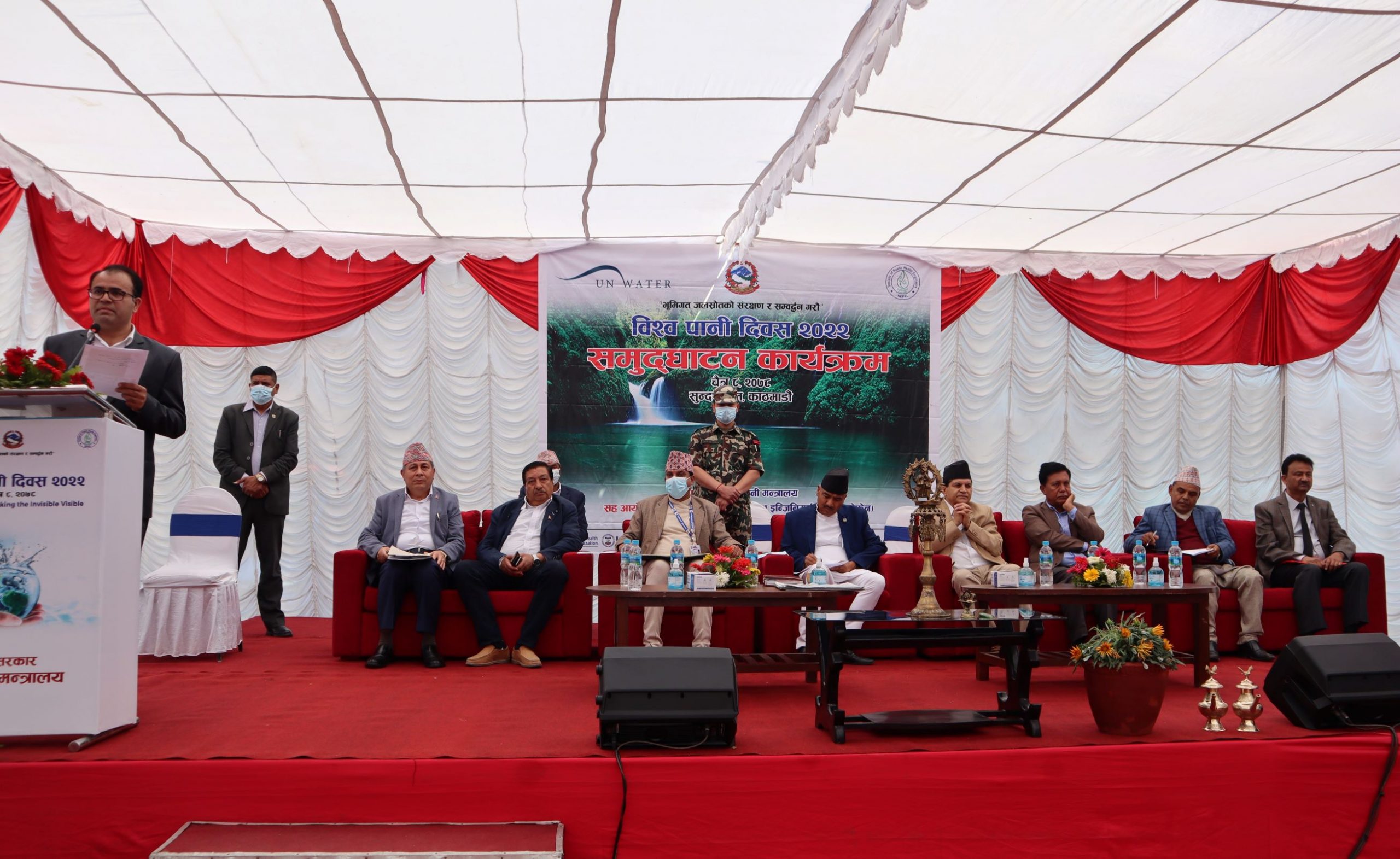 काठमाडौ : विश्व पानी दिवस मनाउन सुन्दरीजलमा आयोजित कार्यक्रम स्थल मन्त्री, सचिव तथा सरकारका उच्च पदस्थ कर्मचारी एवं विद्यार्थीहरुले भरिभराउ थियो । लघु नाटक प्रदर्शन, ‘पानी र जीवनको यात्रा अनन्त’ नामक गीतको विमोचन एवं ‘जलस्रोतको महत्व र उपयोगिता’ सम्बन्धी वक्तृत्वकला प्रतियोगिता, दिवसका प्रमुख कार्यक्रमहरु थिए ।