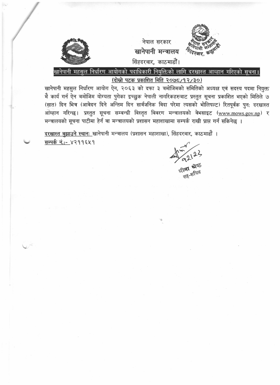 २०७८ वैशाखमै दोस्रो पटक दरखास्त आव्हान गरेको भएपनि मन्त्रालयले यसपटक पनि दोस्रो पटक नै भनेर सूचना प्रकाशन गरेको छ । मन्त्रालयले २०७८ वैशाख ३० गतेको मितिले ७ दिनभित्र खानेपानी मन्त्रालयको प्रशासन महाशाखामा रितपूर्वक दरखास्त दिन सकिने जनाएको छ ।