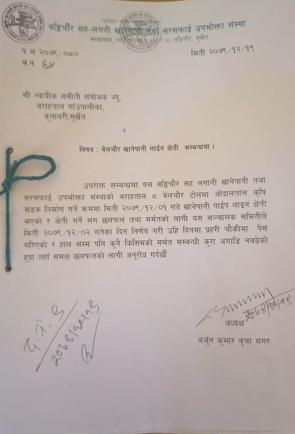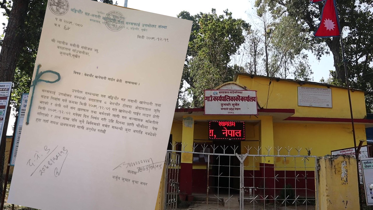 बराहताल गाउँपालिका वडा नं. ८ को कार्यालयले बड्डीचौर सहलगानी खानेपानी तथा सरसफाइ उपभोक्ता संस्थालाई खानेपानी पाइप मर्मत गरिदिन पत्राचार गरिसकेको छ । वडा कार्यालयले लेखेको पत्रमा भनिएको ‘सडक निर्माण गर्ने क्रममा पाइप काटिएकोमा सडक निर्माण कन्स्ट्रक्सनले क्षति भए भन्दा बढी पाइप उपलब्ध गराएकोमा त्यहाँका बासिन्दहरुले बारम्बार पाइपलाइन मर्मत गरिदिन आग्रह गर्दा पनि तहाँ संस्थाले खानेपानी पाइप मर्मत गरी खानेपानी उपलब्ध गराउने कार्यमा ढिलासुस्ती गरेकाले बेलचौर टोलमा खानेपानीको अभाव भएको भन्ने जनगुनासो आएको हुनाले तुरुन्त प्राविधिक टोली खटाई खानेपानी पाईप मर्मत गरी खानेपानी उपलब्ध गराईदिनका लागि अनुरोध छ ।’