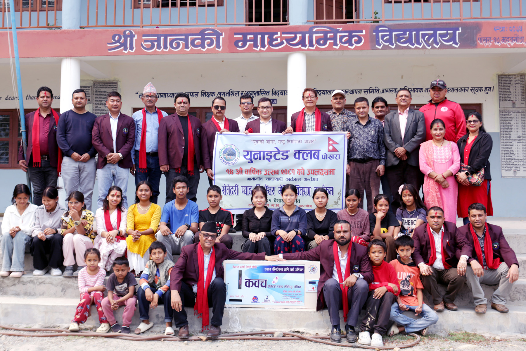 पोखरा : यूनाइटेड क्लबले १४ औं वार्षिकोत्सवको अवसरमा आयोजित सप्ताहब्यापी कार्यक्रम अन्तर्गत चौथो दिन मंगलबार पोखरा–१७ महतगौंडामा रहेको जानकी माविमा अध्ययनरत छात्रालाई लक्षित गरी सेनिटरी प्याड भेण्डिङ मेसिन वितरण गरेको छ ।