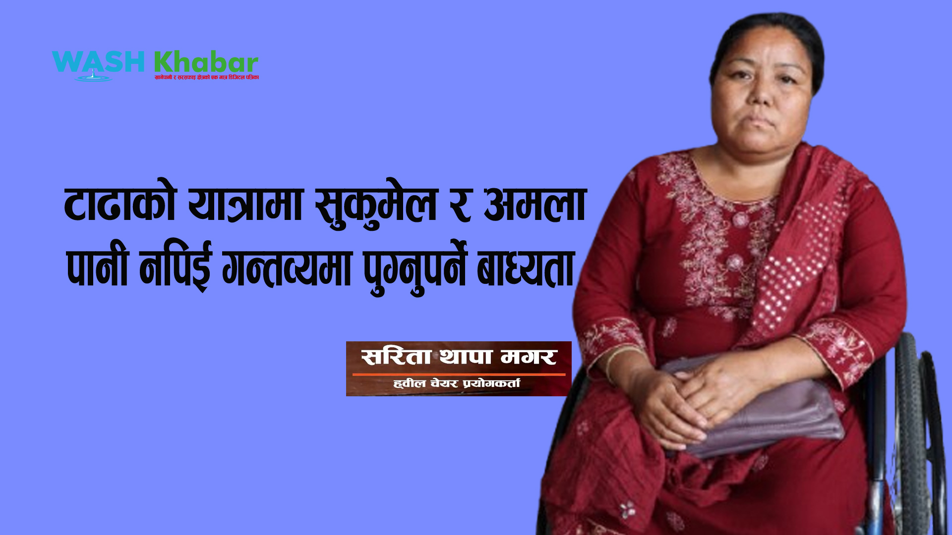 अपाङ्गतामैत्री शौचालय नहुँदा अपाङ्गता भएका व्यक्तिहरु, अझ त्यसमा पनि ह्वीलचेयर प्रयोगकर्ताहरुको अवस्था एकदम दयनीय छ । उनीहरुले यात्राको क्रममा पिसाब आउने भयले एक थोपा पानी पनि नपिई गन्तव्यमा पुग्नुपर्ने बाध्यता छ। पानी नपिई यात्रा गर्नुपर्दा ओठ मुख सुक्ने भएकाले उनीहरु पानीको सट्टा अमला वा सुकुमेल च्यापेर यात्रा गर्छन् ।