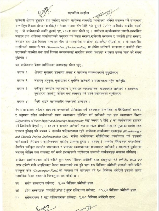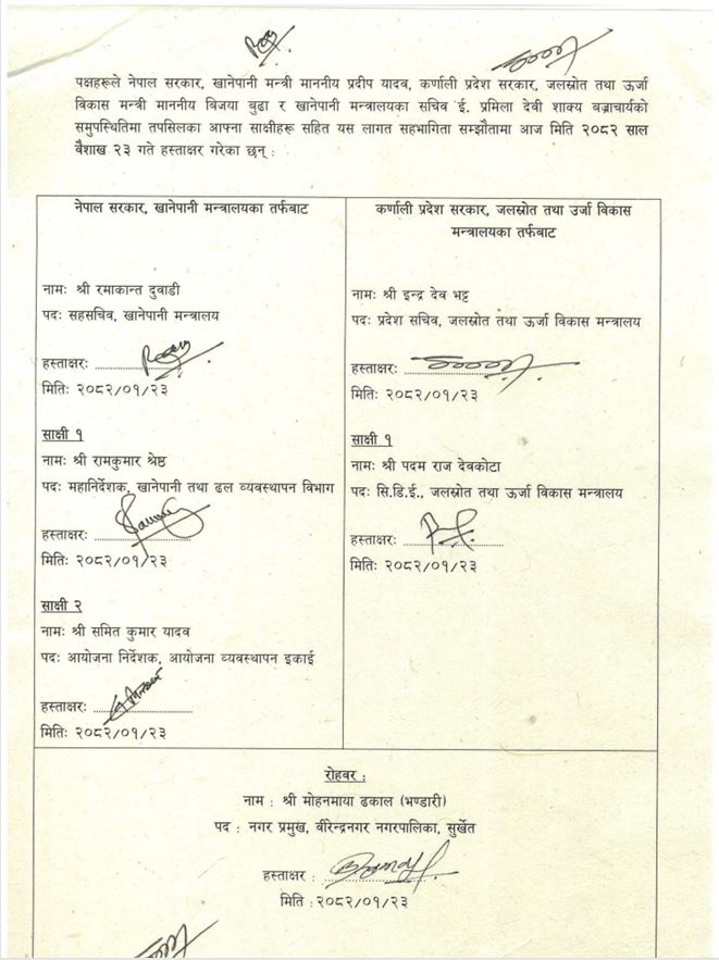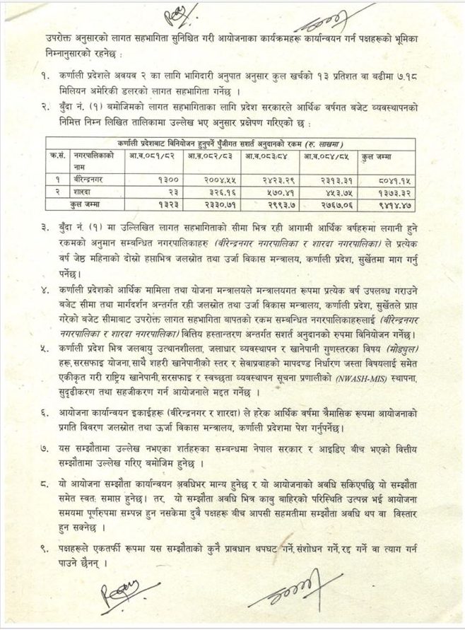 संघीय खानेपानी मन्त्री प्रदीप यादव, कर्णाली प्रदेशकी जलस्रोत तथा ऊर्जा विकास मन्त्री बिजया बुढा र खानेपानी मन्त्रालयका सचिव प्रमिलादेवी शाक्य बज्राचार्यको उपस्थितिमा भएको लागत सहभागिता सम्बन्धी सम्झौतामा खानेपानी मन्त्रालयका सहसचिव रमाकान्त दुवाडी र जलस्रोत तथा ऊर्जा विकास मन्त्रालय कर्णाली प्रदेशका सचिव इन्द्रदेव भट्टले हस्ताक्षर गर्नुभयो।