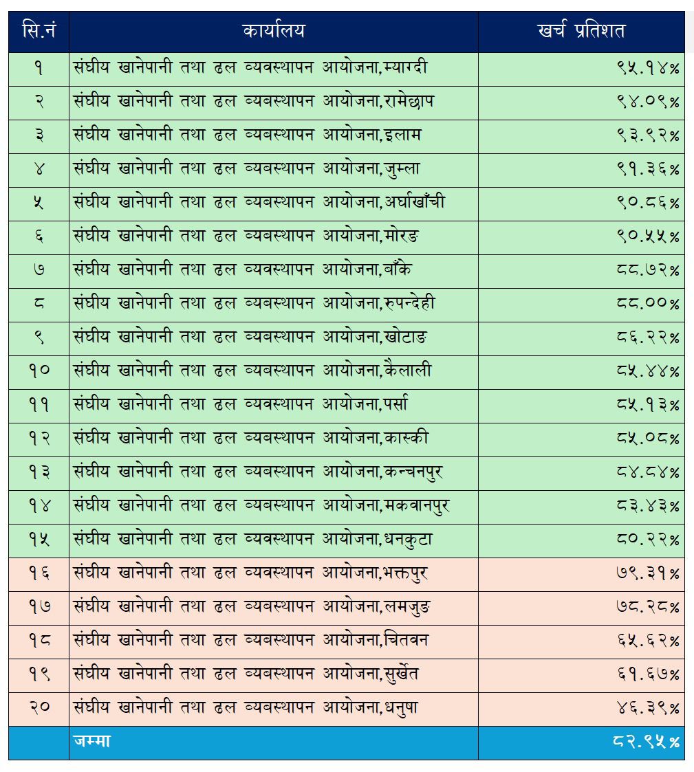 “केही कार्यालयले कम प्रगति हासिल गरेपनि समग्रतामा हामीले ८२ प्रतिशत भन्दा माथि वित्तीय प्रगति गर्न सफल भएका छौं, जुन सकारात्मक कुरा हो” खानेपानी तथा ढल व्यवस्थापन विभागका महानिर्देशक ई.राम कुमार श्रेष्ठले भन्नुभयो। राम्रो नतिजा निकाल्न सफल कार्यालयहरुले आफ्नो कार्ययोजना समयमै कार्यान्वयन गर्नुका साथै बजेट उपयोगमा समेत दक्षता देखाएको विभागको भनाइ छ ।