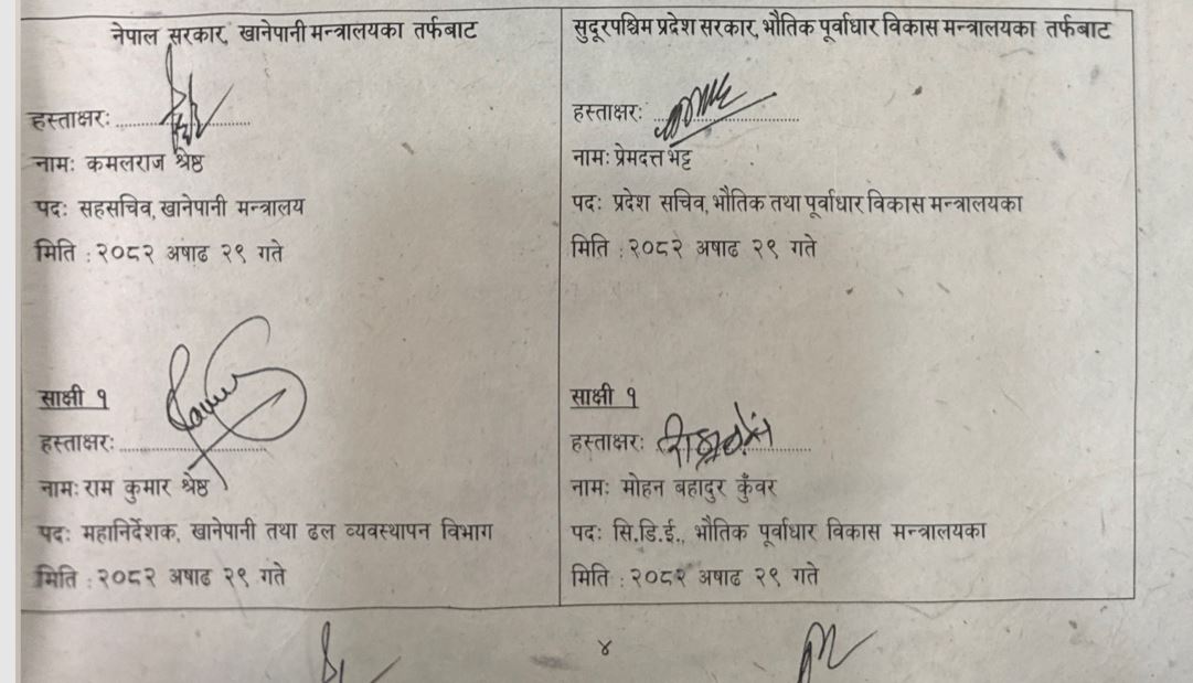 समझदारीमा संघीय खानेपानी मन्त्रालयका तर्फबाट सहसचिव कमलराज श्रेष्ठले हस्ताक्षर गर्नु भएको छ भने प्रदेश सरकारको तर्फबाट भौतिक पूर्वाधार विकास मन्त्रालयका सचिव प्रेमदत्त भट्टले हस्ताक्षर गर्नु भएको छ । साक्षीका रूपमा संघीय खानेपानी तथा ढल व्यवस्थापन विभागका महानिर्देशक ई. राम कुमार श्रेष्ठ र सुदूरपश्चिम भौतिक पूर्वाधार मन्त्रालयका सिडिई मोहन बहादुर कुँवरले हस्ताक्षर गर्नु भएको छ ।