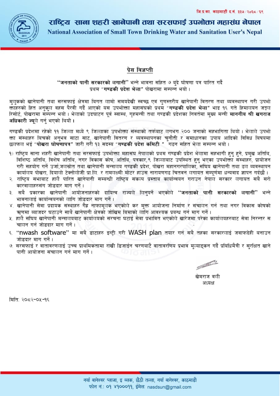 गण्डकी प्रदेशका ११ जिल्ला मध्ये ९ जिल्लाबाट करिब २०० प्रतिनिधिहरुको सहभागिता रहेको भेलाले उपभोक्ता संस्थाहरु बीच अनुभव साटासाट, खानेपानी वितरण र व्यवस्थापनका चुनौती तथा समाधानबारे गहन छलफल गर्दै “पोखरा घोषणापत्र” जारी गरेको छ। भेलाले ११ सदस्यीय गण्डकी प्रदेश समिति पनि सर्वसम्मत गठन गरेको छ।