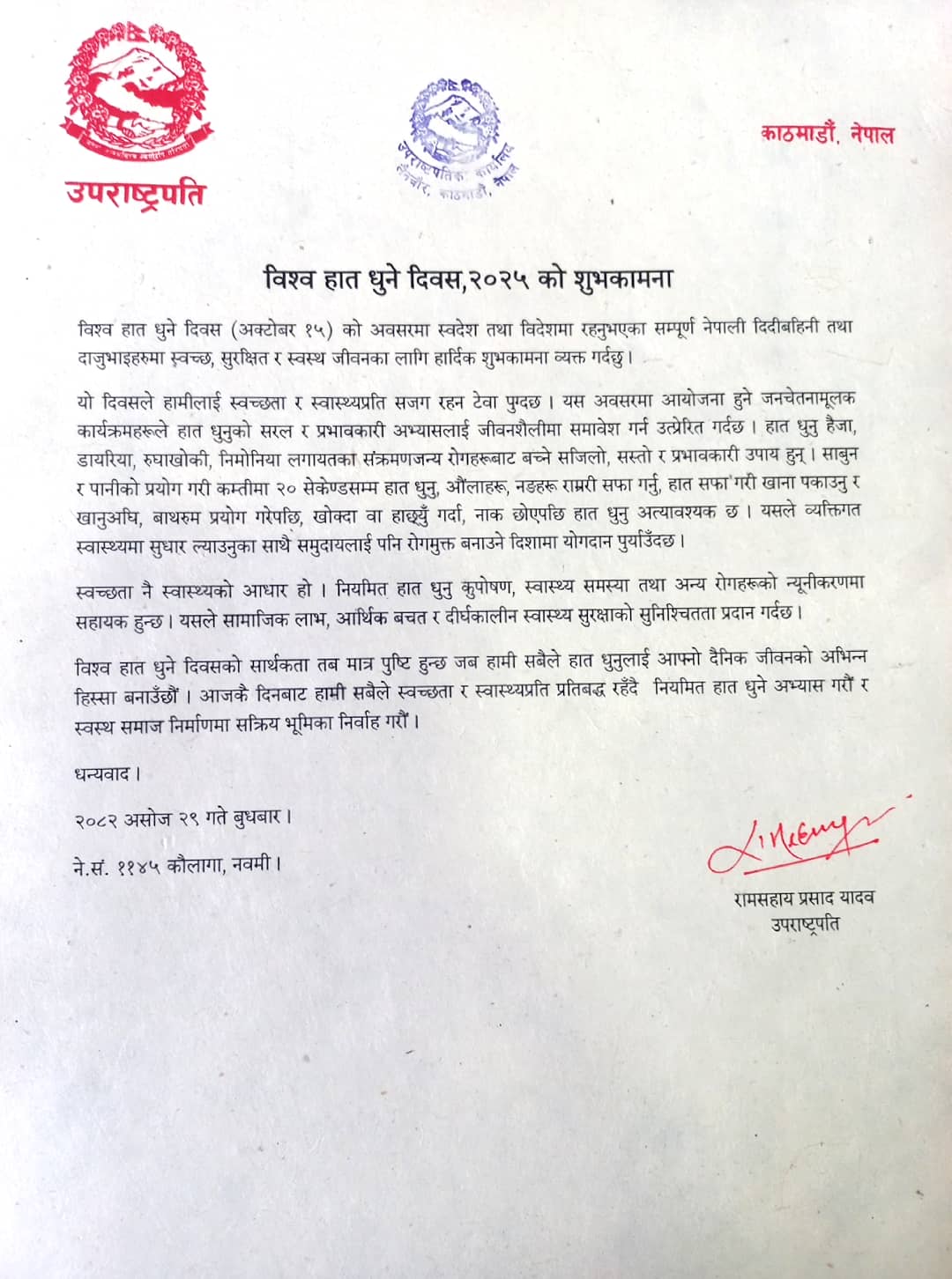“स्वच्छता नै स्वास्थ्यको आधार हो,” उहाँले सन्देशमा उल्लेख गर्नुभएको छ, “नियमित हात धुनुले कुपोषण, स्वास्थ्य समस्या तथा अन्य रोगहरूको न्यूनीकरणमा मद्दत पुर्याउँछ र सामाजिक लाभ, आर्थिक बचत तथा दीर्घकालीन स्वास्थ्य सुरक्षाको सुनिश्चितता प्रदान गर्दछ।”