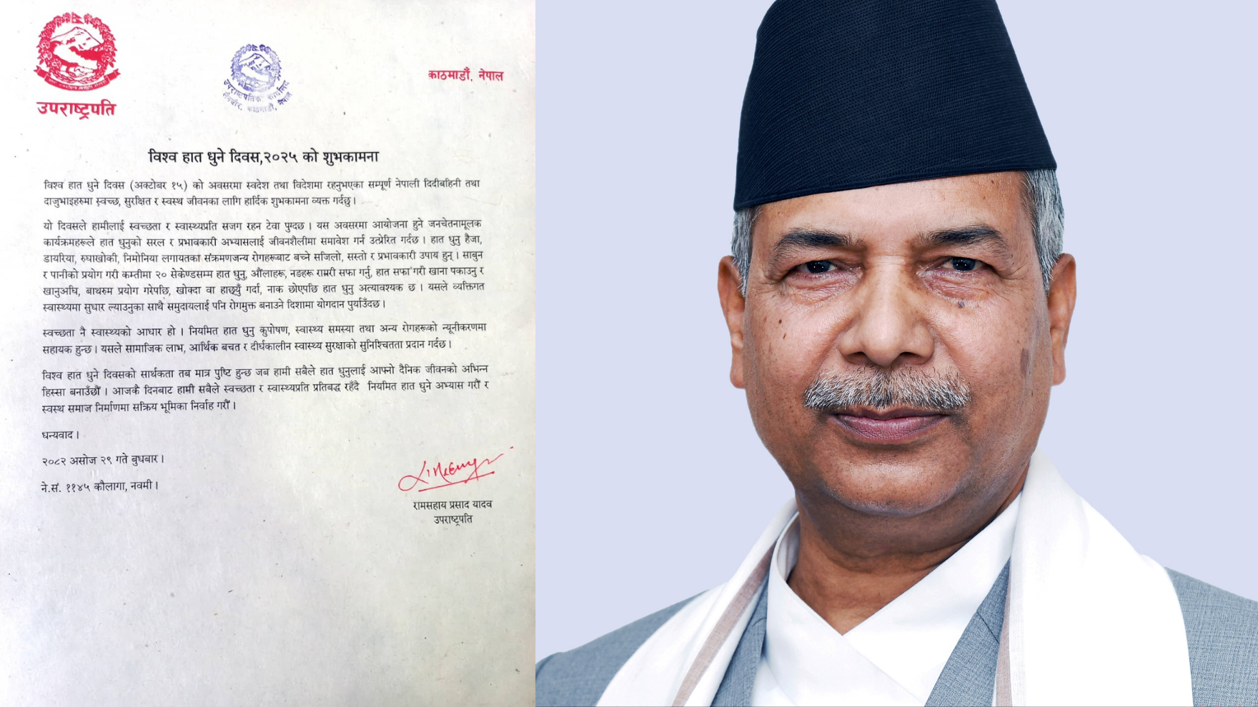 काठमाडौं : उपराष्ट्रपति रामसहाय प्रसाद यादवले विश्व हात धुने दिवस २०२५ को अवसरमा स्वदेश तथा विदेशमा रहेका सम्पूर्ण नेपाली दिदीबहिनी तथा दाजुभाइहरूमा स्वच्छ, सुरक्षित र स्वस्थ जीवनका लागि हार्दिक शुभकामना व्यक्त गर्नुभएको छ।