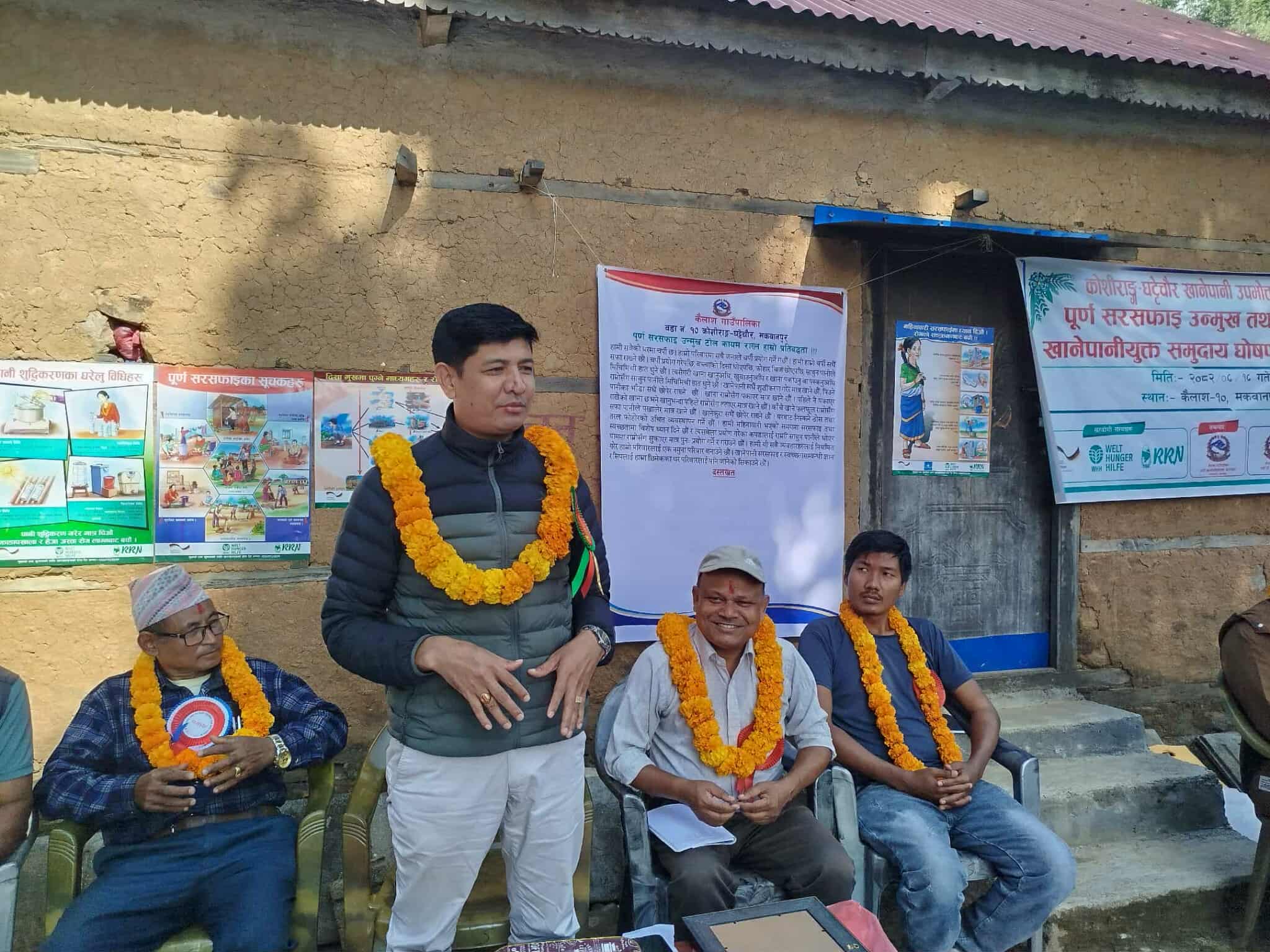 मकवानपुर : मकवानपुरको कैलाश गाउँपालिकाको ६ वटा टोललाई पूर्ण सरसफाइ उन्मुख तथा सुरक्षित खानेपानीयुक्त समुदाय घोषणा गरिएको छ। कैलाशको वडा नं.७ को ताम्लाङ – रतुवा, वडा नं. ९ को सागिने र वडा नं. १० को कोशीराङ–घट्टेचौर, कुमलटार, भाल्टार र बाँझोखेत टोललाई सोमबार र मंगलबार घोषणा गरिएको हो।