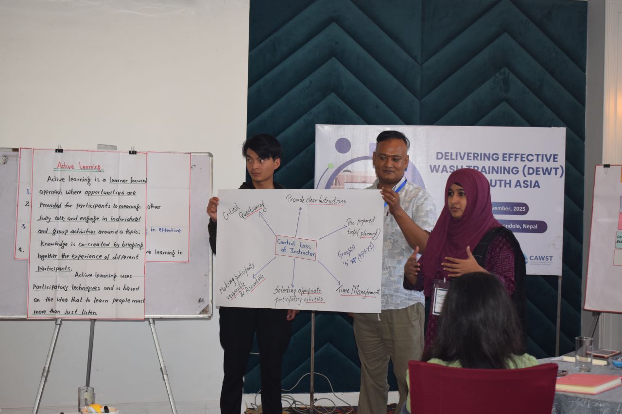 पाँच दिनसम्म सन्चालन भएको तालिममा दक्षिण एसियाली राष्ट्रहरु भारत, भुटान, श्रीलंका र बंगलादेश तथा नेपालको तर्फबाट राष्ट्रिय खानेपानी तथा सरसफाइ अनुसन्धान, नवप्रवर्तन तथा क्षमता अभिवृद्धि केन्द्र’ नगरकोट, प्राविधिक प्रशिक्षण प्रतिष्ठान भक्तपुर, स्थानीय विकास प्रशिक्षण प्रतिष्ठान जावलाखेल ललितपुरका गरी १६ जनाको सहभागिता थियो।