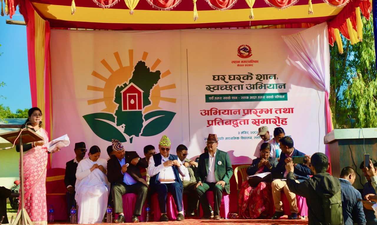 सिराहा : सिराहा जिल्लाको लहान नगरपालिकाले सरसफाइ तथा सार्वजनिक स्वास्थ्यमा देखापरेका चुनौतीहरू समाधान गर्न “घर–घरको शान, स्वच्छता अभियान” को औपचारिक शुभारम्भ गरेको छ। विश्व शौचालय दिवस, १९ नोभेम्बर २०२५ को अवसर पारेर खानेपानी मन्त्रालयका सहसचिव एवं प्रवक्ता मीना श्रेष्ठ तथा मन्त्रालयकै सिनियर डिभिज्नल इन्जिनियर योगेन्द्र चित्रकार, वाटर एड नेपालका कन्ट्री डाइरेक्टर सुदर्शन न्यौपानेको उपस्थितिमा लहान नगरपालिकाका मेयर महेश प्रसाद चौधरीले अभियानको शुभारम्भ गर्नुभयो।