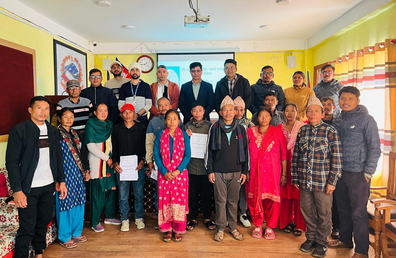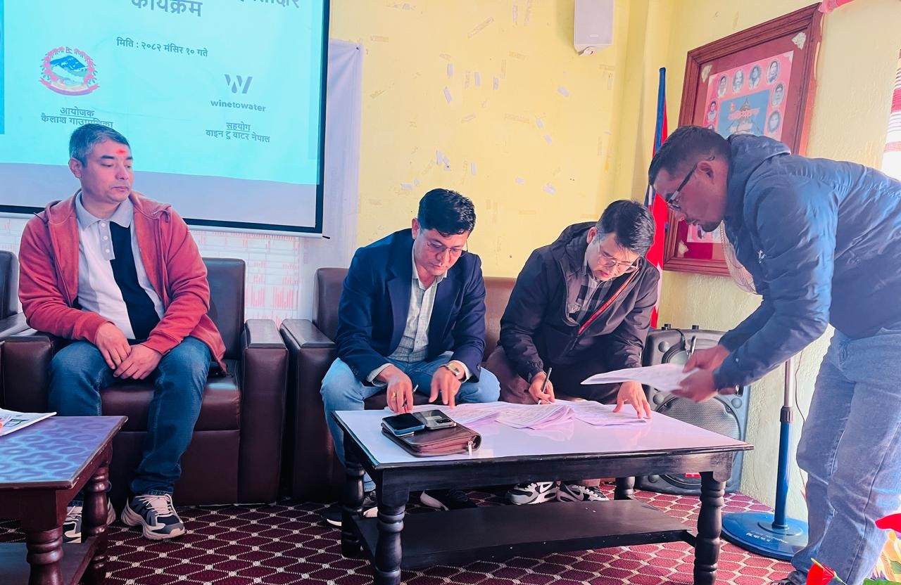 ‘एक घर–एक धारा’ लक्ष्य सहित २८२ घरधुरीमा धारा जडान गर्ने उद्देश्यले गरिएको सम्झौता पत्रमा गाउँपालिकाको तर्फबाट अध्यक्ष लोकबहादुर मुक्तान, वाइन टु वाटरको तर्फबाट राष्ट्रिय निर्देशक निजन श्रेष्ठ र सम्बन्धित उपभोक्ता समितिका अध्यक्षहरुले हस्ताक्षर गर्नुभएको छ ।