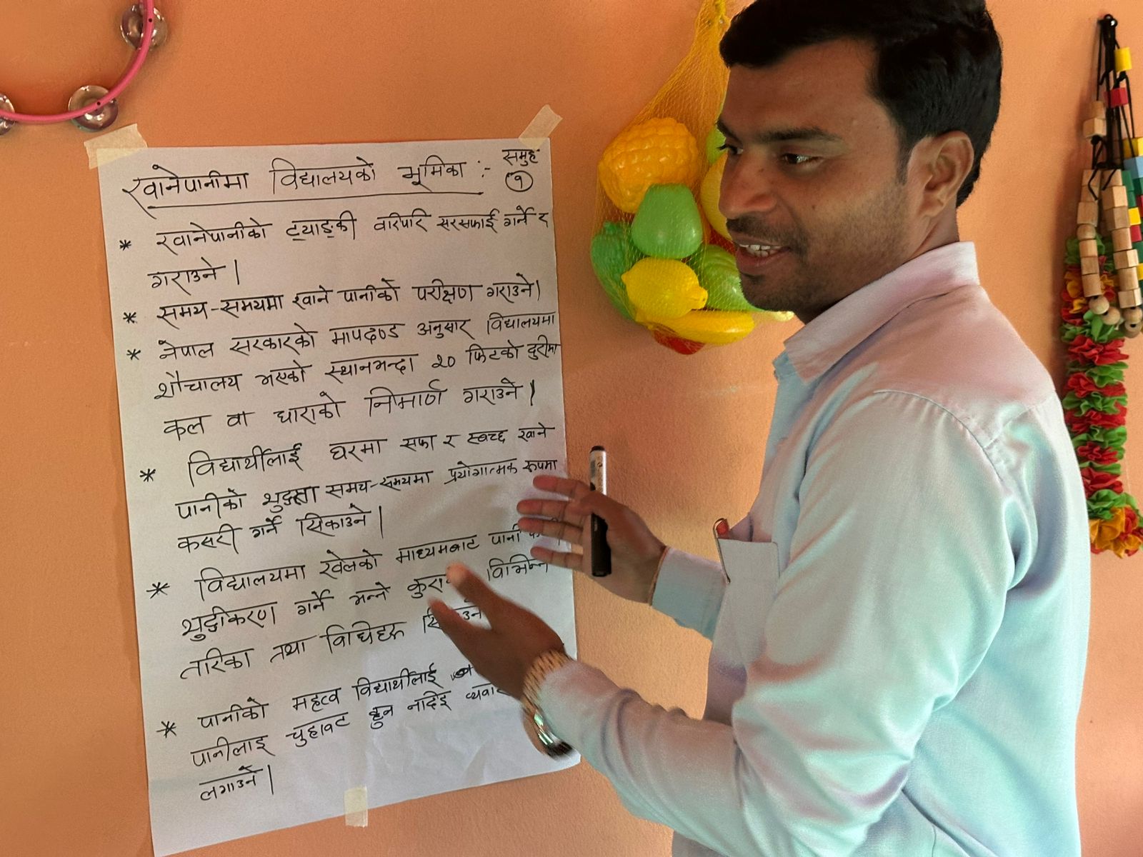 अभिमुखीकरण कार्यक्रममा सुरक्षित खानेपानी, सरसफाइ र शौचालयको व्यवस्थापन तथा व्यक्तिगत स्वच्छताका मुख्य पक्षहरूबारे प्रशिक्षकले विस्तृत रुपमा प्राविधिक जानकारी प्रस्तुत गरेका थिए।