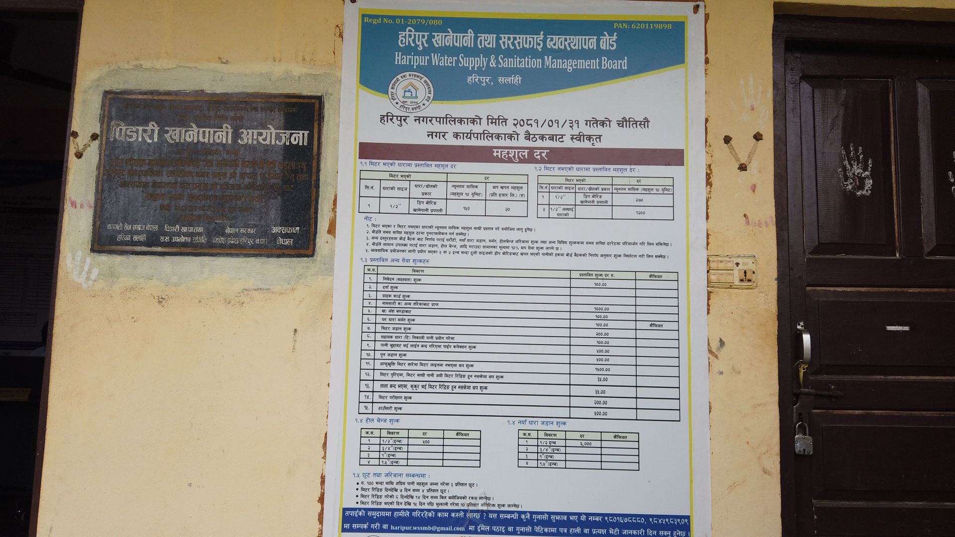 The Board has fixed a tariff of NPR 150 for consumption up to 10 units. Consumption beyond that is charged at NPR 20 per additional unit. This tariff rate was approved by the municipal executive meeting of Haripur Municipality on Baisakh 31, 2081.