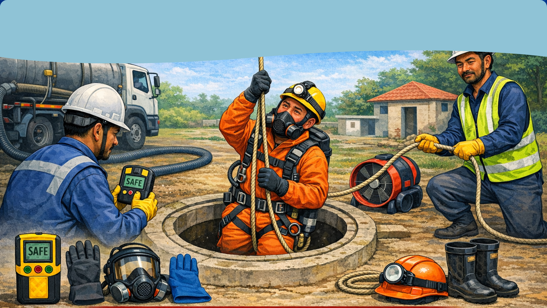 सेफ्टी बेल्ट र डोरी : भित्र छिर्ने व्यक्तिलाई बाहिरबाट डोरीले बाँधेर राख्नुपर्छ, ताकि आपतकालमा तुरुन्त बाहिर निकाल्न सकियोस्।