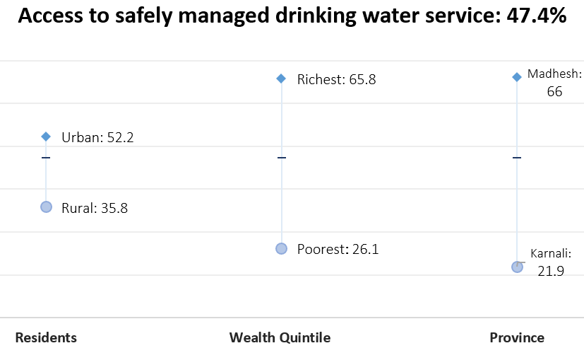 MICS 2019 मा राष्ट्रिय स्तरमा सुरक्षित खानेपानी सेवा करिब १९ प्रतिशत मात्र रहेकोमा MICS 2025 मा यो प्रतिशत बढेर करिब ४७ प्रतिशतभन्दा माथि पुगेको देखिएको छ । प्रदेशगत रूपमा समेत उल्लेखनीय प्रगति भएको छ।