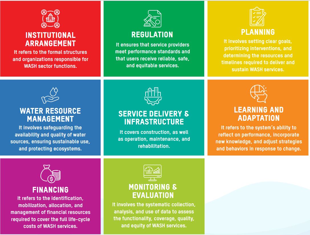 मार्गदर्शनमा वास प्रणाली सुदृढीकरणका लागि पहिचान गरिएका आठ वटा आधारस्तम्भहरु (Building Blocks) : Institutional Arrangement, Regulation, Planning, Water Resource Management, Service Delivery & Infrastructure, Learning & Adaptation, Financing र Monitoring & Evaluation लाई क्रमबद्ध र कार्यान्वयनयोग्य चरणमा रूपान्तरण गरिएको छ।