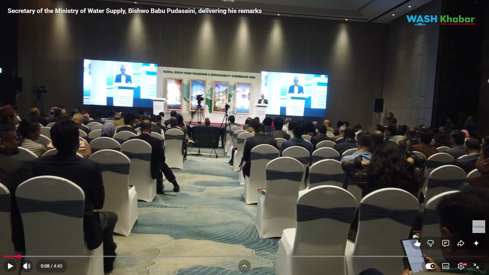 ललितपुरमा सुरु भएको ‘ग्लोबल साउथ WASH Financing & Sustainability Conference 2026’ को उद्घाटन सत्रलाई सम्बोधन गर्दै उहाँले सुरक्षित खानेपानी र दिगो सरसफाइ सेवा सुनिश्चित गर्न परम्परागत बजेट प्रणाली मात्र पर्याप्त नभएको स्पष्ट पार्नुभयो।