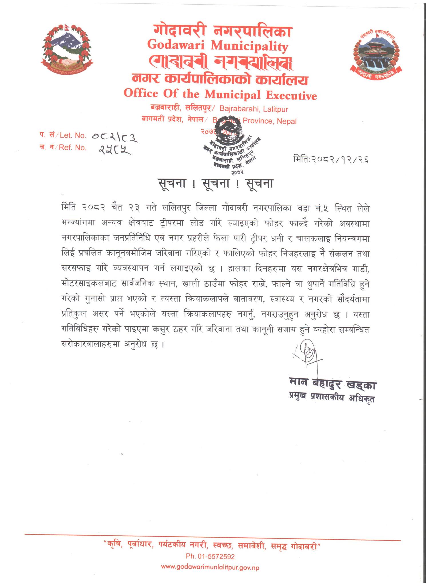 गोदावरी नगरपालिकाले सफा, स्वस्थ र व्यवस्थित नगर निर्माणका लागि सार्वजनिक स्थानमा जथाभावी फोहर फाल्ने कार्य पूर्ण रूपमा रोक्न स्थानीयवासी, सवारीधनी तथा व्यवसायीहरूलाई विशेष आग्रह गरेको छ।