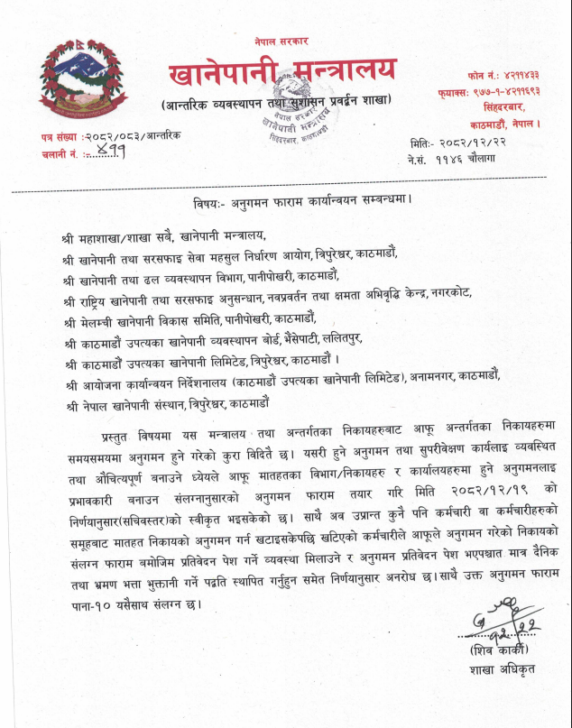 पत्र अनुसार अबदेखि कुनै पनि कर्मचारी वा कर्मचारीहरूको टोलीलाई मातहत निकायको अनुगमनका लागि खटाइएपछि खटिएको कर्मचारीले अनुगमन सम्पन्न भएको निकायको प्रतिवेदन अनिवार्य रूपमा नयाँ फाराम बमोजिम पेश गर्नुपर्नेछ।