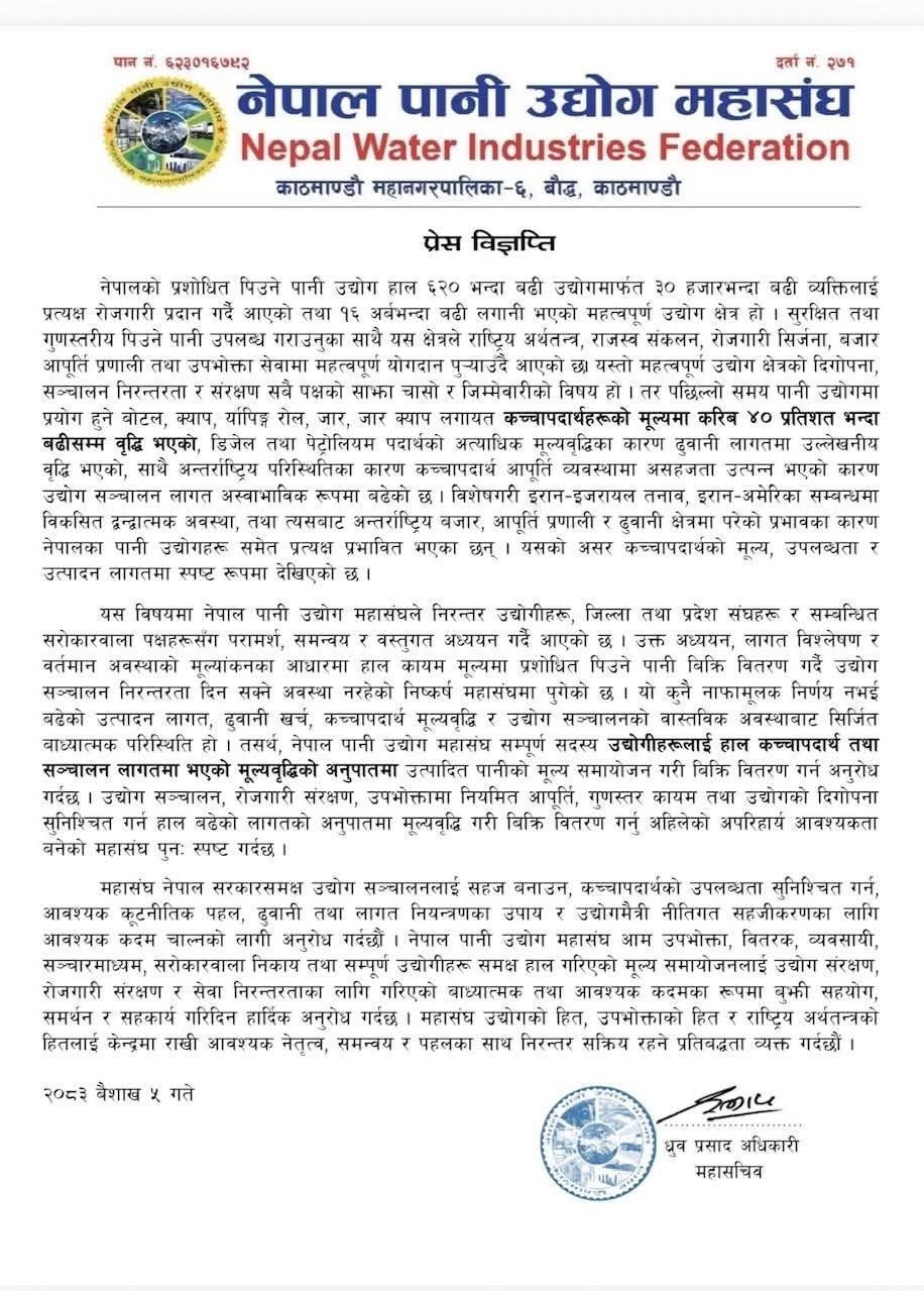 हाल देशभर करिब ६२० भन्दा बढी पानी उद्योग सञ्चालनमा रहेका छन्, जसमा १६ अर्ब रुपैयाँभन्दा बढीको लगानी रहेको छ। यस क्षेत्रले ३० हजारभन्दा बढी व्यक्तिलाई प्रत्यक्ष रोजगारी प्रदान गर्दै आएको छ र सुरक्षित तथा गुणस्तरीय पानी आपूर्ति मार्फत राष्ट्रिय अर्थतन्त्रमा महत्वपूर्ण योगदान पुर्याउँदै आएको छ। तर बढ्दो लागतका कारण उद्योगहरू संकटमा पर्न सक्ने चिन्ता महासंघका महासचिव ध्रुवप्रसाद अधिकारीले व्यक्त गर्नुभएको छ।