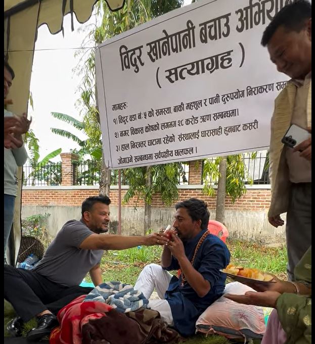 विदुर खानेपानी तथा सरसफाइ उपभोक्ता संस्थाका सचिव रघुनाथ रिमालले राखेका मागहरू विदुर नगरपालिकाले सम्बोधन गर्ने प्रतिबद्धता पछि नगरपालिकाका मेयर राजन श्रेष्ठले जुस खुवाउँदै औपचारिक रूपमा सत्याग्रह तोडाएका हुन्।