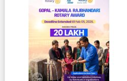 काठमाडौं : रोटरी इन्टरनेशनल डिस्ट्रिक्ट ३२९२ ले पानी तथा सरसफाइ (WASH) क्षेत्रमा उल्लेखनीय योगदान पुर्याउने व्यक्ति वा संस्थालाई प्रदान गरिने गोपाल–कमला राजभण्डारी रोटरी पुरस्कार घोषणा गरेको छ। उक्त पुरस्कारको राशि रुपैयाँ २० लाख रहेको छ। यो पुरस्कार १८औँ डिस्ट्रिक्ट सम्मेलनको अवसरमा प्रदान गरिनेछ, जुन सम्मे...